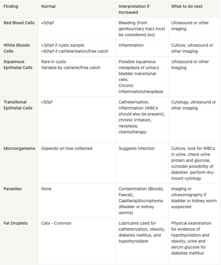 Examine 10 fields - assess the morphology of structures observed at 10x magnificationConfirm the identification of the structures observed at low power. Inspect epithelial cells for dysplastic or neoplastic cytomorphology Inspect the slide for the presence of the following and assess the number of each in the unstained wet mount:Red Blood Cells (Erythrocytes):1. Record the number of redblood cells per high-power field (hpf) as a range (e.g., 2-4/hpf)Leukocytes (White Blood Cells):1. Record the number of leukocytes as a range (e.g., 0-3/hpt)Microorganisms (e.g., bacteria, yeast, fungi, algae)1. Record morphology of bacteria (e.g.. cocci, bacilli, filamentous, spore-forming).